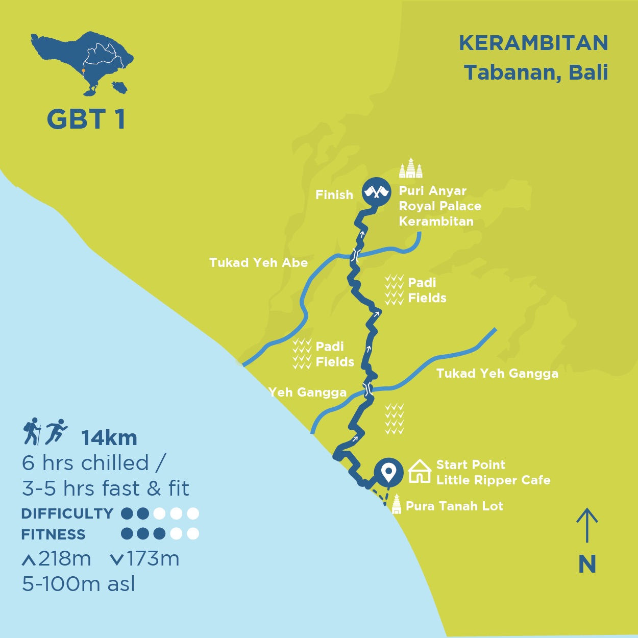 Kick-off in Kedungu to a Royal Arrival in Kerambitan The first stage of The Great Bali Trail, the only stage with a coastal walkA flattish traverse and an easy half-day hike or run discovering the coast beyond Tanah Lot temple and into the emerald padi fields of Tabanan via Yeh Gangga.